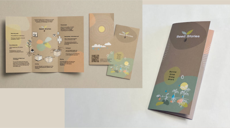 Frøpakkene og frøkortene er de viktigste elementene brukeren tar med seg fra biblioteket. Frøpakken oppbevarer frøene og kobler dem til systemet gjennom et tydelig og enkelt format, mens frøkortet gir informasjon om frøenes bakgrunn og leder videre til mer veiledning og delt kunnskap. Sammen fungerer de både som praktiske beholdere og som bærere av forståelse.